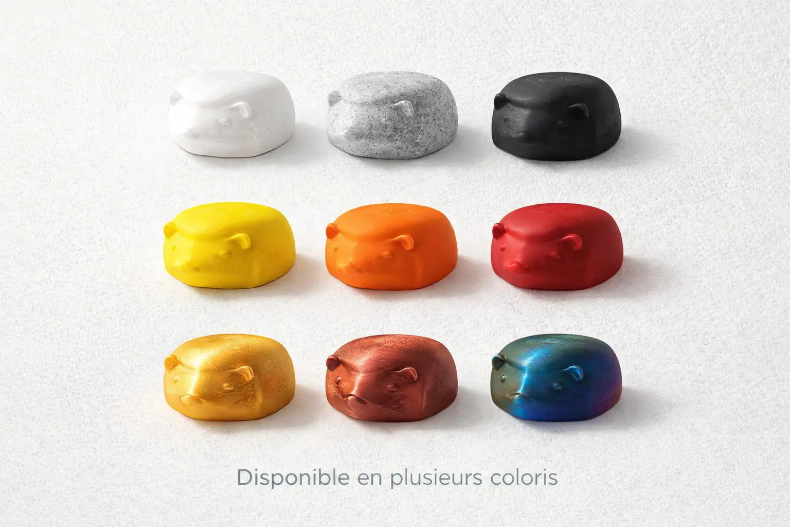 Chaque hérisson représente une couleur spécifique afin de faciliter le choix avant commande. Ces échantillons offrent un aperçu fidèle des rendus et des finitions, et constituent un support pratique et esthétique pour comparer les coloris disponibles.