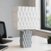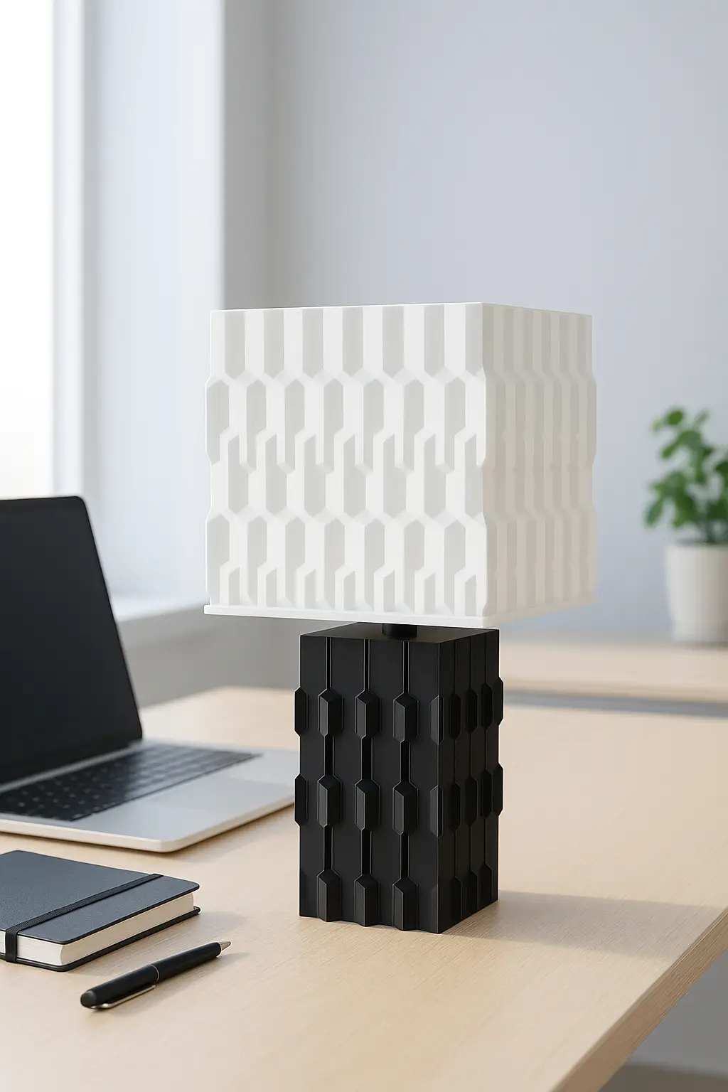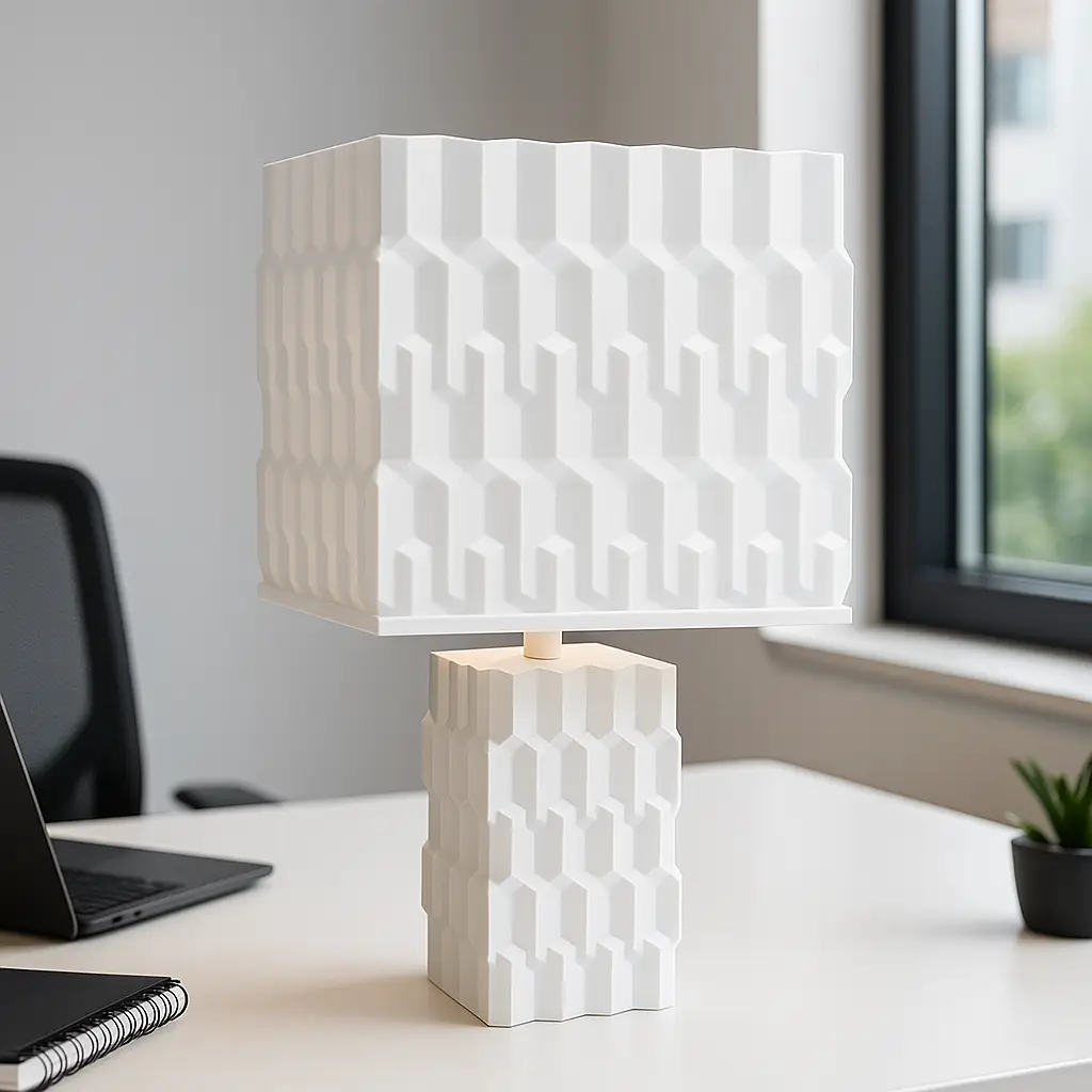 Son pied sculptural, composé de motifs géométriques en relief, soutient un abat-jour cubique texturé qui joue avec la lumière pour créer des ombres élégantes.